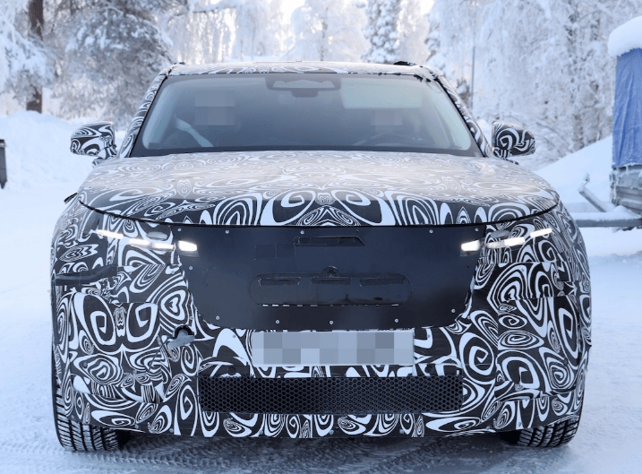 车头部分,厚重伪装已基本移除,露出部分设计细节。格栅上方采用细长条状LED头灯组,下方配备小型通风口。由于纯电动驱动系统无需进气散热,前脸设计更显简洁流畅。这一调整不仅符合电动车型特性,也强化了路虎品牌向新能源转型的视觉标识。
