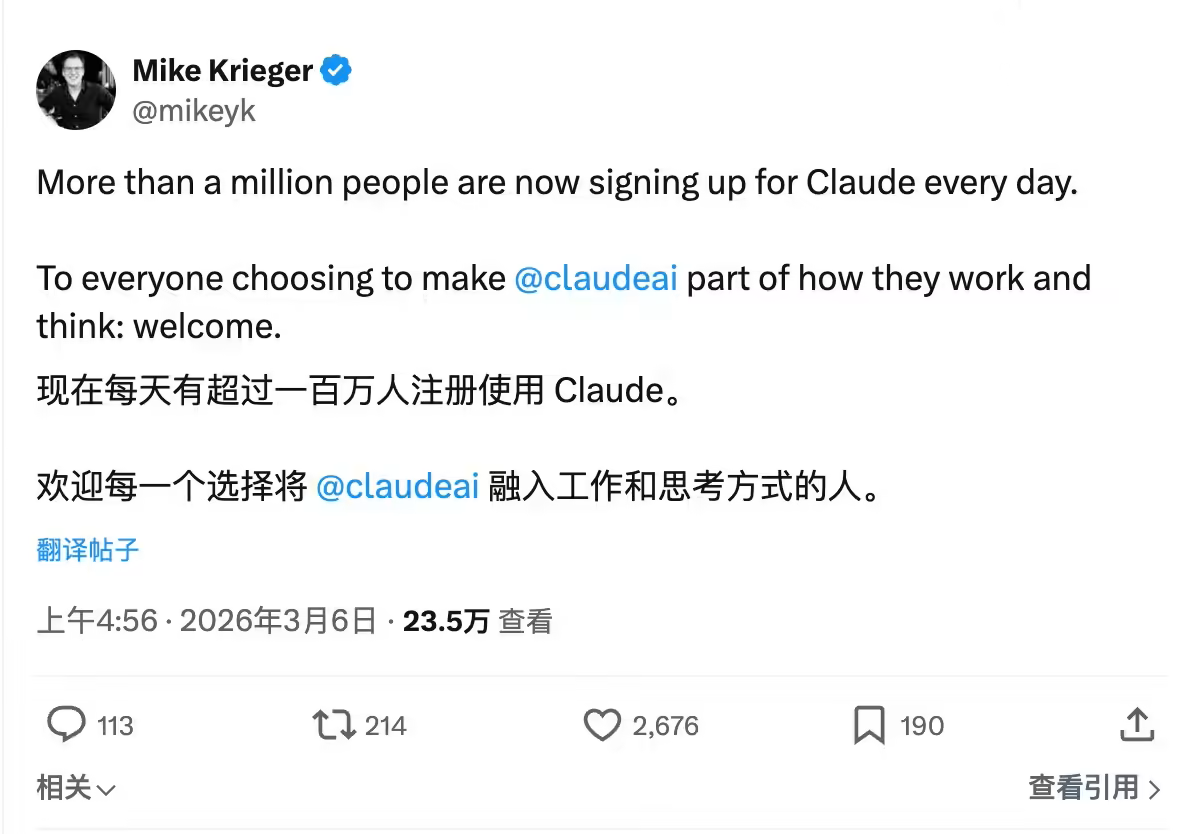 近日,人工智能领域传来新动态,Anthropic公司高管迈克·克里格在社交平台X上透露,其旗下AI聊天机器人Claude的每日新增用户量已突破100万大关。克里格于2024年加入Anthropic,起初担任产品负责人,如今负责该公司新成立的实验部门。