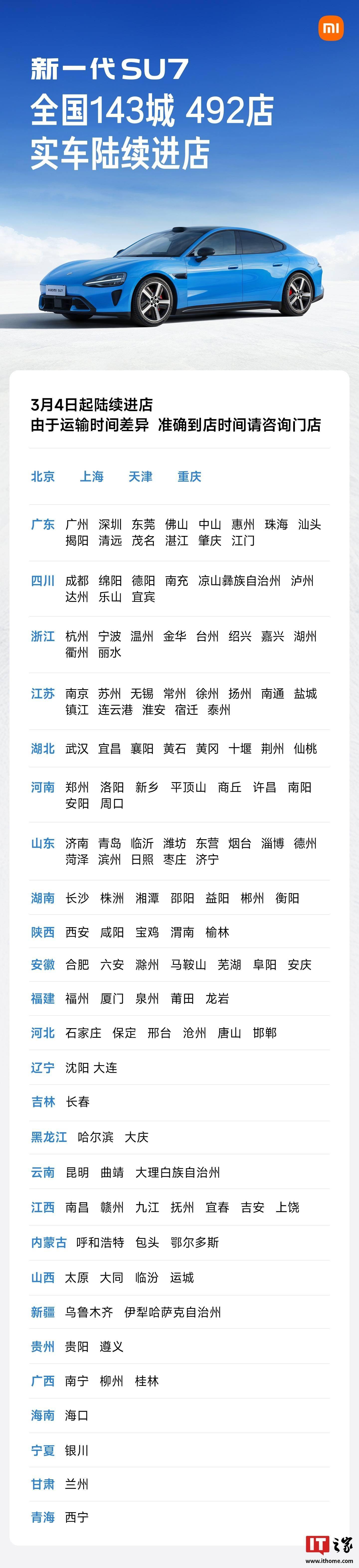 小米汽车近日宣布,新一代SU7实车已陆续抵达全国143个城市的492家门店,覆盖范围包括北京、上海、天津、重庆等主要城市。这一布局标志着小米汽车正式开启线下展示阶段,为消费者提供近距离体验新车的机会。