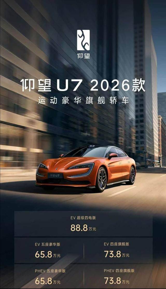 在60-90万元级豪华大型轿车市场,一场由国产车型主导的变革正在悄然发生。2026款仰望U7以65.8万元的起售价强势入局,推出5款配置车型,不仅搭载第二代刀片电池实现1006公里纯电续航,还提供综合续航1100公里的插混版本,配合易四方架构与云辇-Z智能底盘系统,直接向宝马7系纯电版发起挑战,试图打破传统豪华品牌的市场垄断。