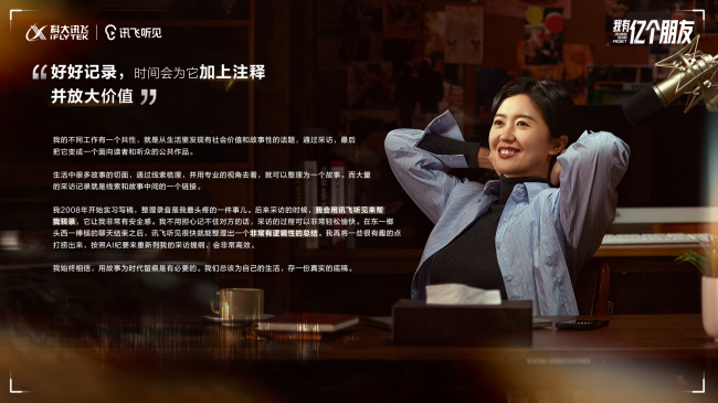 为了让“记录的力量”更具象化、更有感染力,讯飞听见选取了四位不同圈层的记录者朋友,通过他们的真实故事,拆解记录的多元价值,结合动静结合的视觉呈现,让品牌理念落地生根,也让每一位用户都能在故事中看到自己的影子。
