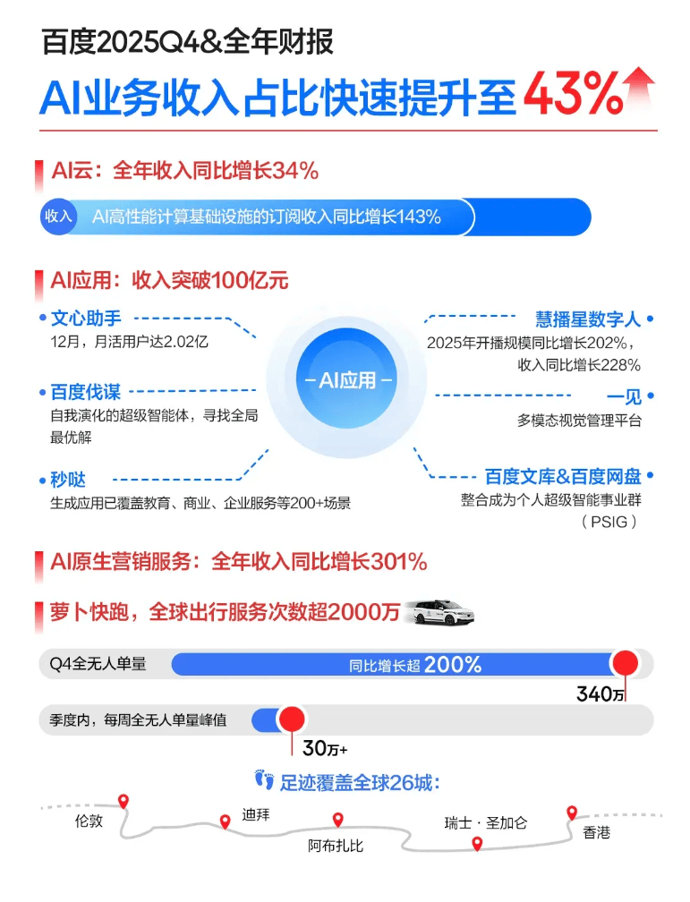 当2025年财务数据公布时,市场目光聚焦于一个关键指标:人工智能业务贡献了43%的营收。这个数字背后,折射出一家传统互联网企业向技术驱动型公司的深度转型。曾经以搜索服务为核心的收入结构,正被芯片研发、云计算服务、智能模型应用和自动驾驶等新兴业务重构。