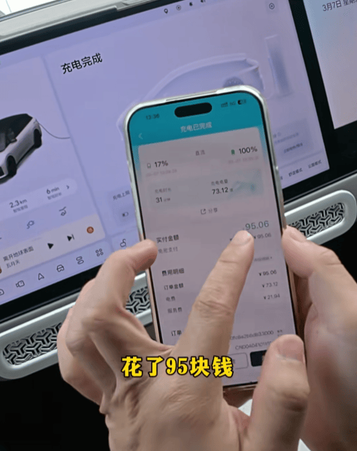尽管受限于车型兼容性,充电功率较理想原厂超充桩降低约100kW,但车主认为仍达到4C充电水平,远超公共充电桩平均效率。最终测试数据显示,车辆从17%电量充至100%共耗时31分钟,累计充入73度电,总花费95元。车主特别提到,充电过程中系统稳定性良好,未出现功率波动或中断情况。