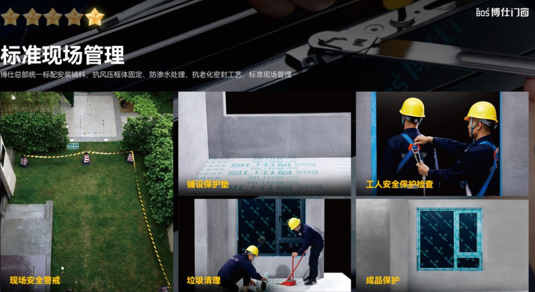 博仕门窗:制定涵盖抗风压、防渗水处理、密封工艺的五星安装标准,打造 29 道标准化安装流程,安装辅料由总部统一标配,物流直达项目现场。施工精度做到极致:框体固定螺丝入墙深度 ≥50mm、间距 ≤500mm,填缝剂微膨胀杜绝开裂,玻璃与框体增加内胶处理,垂直误差低于 0.5 度、水平误差低于 1 度,安装合格率始终保持行业极高水平。