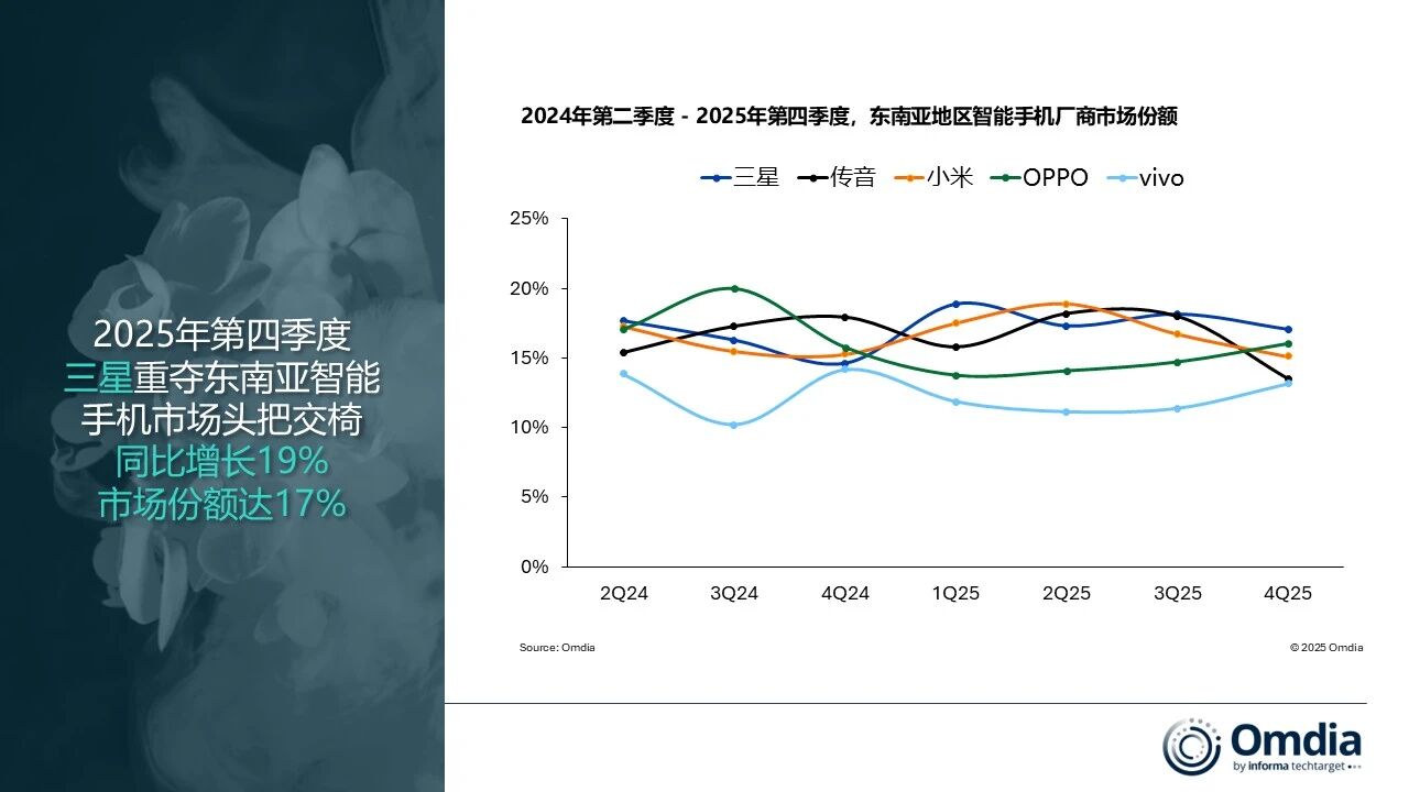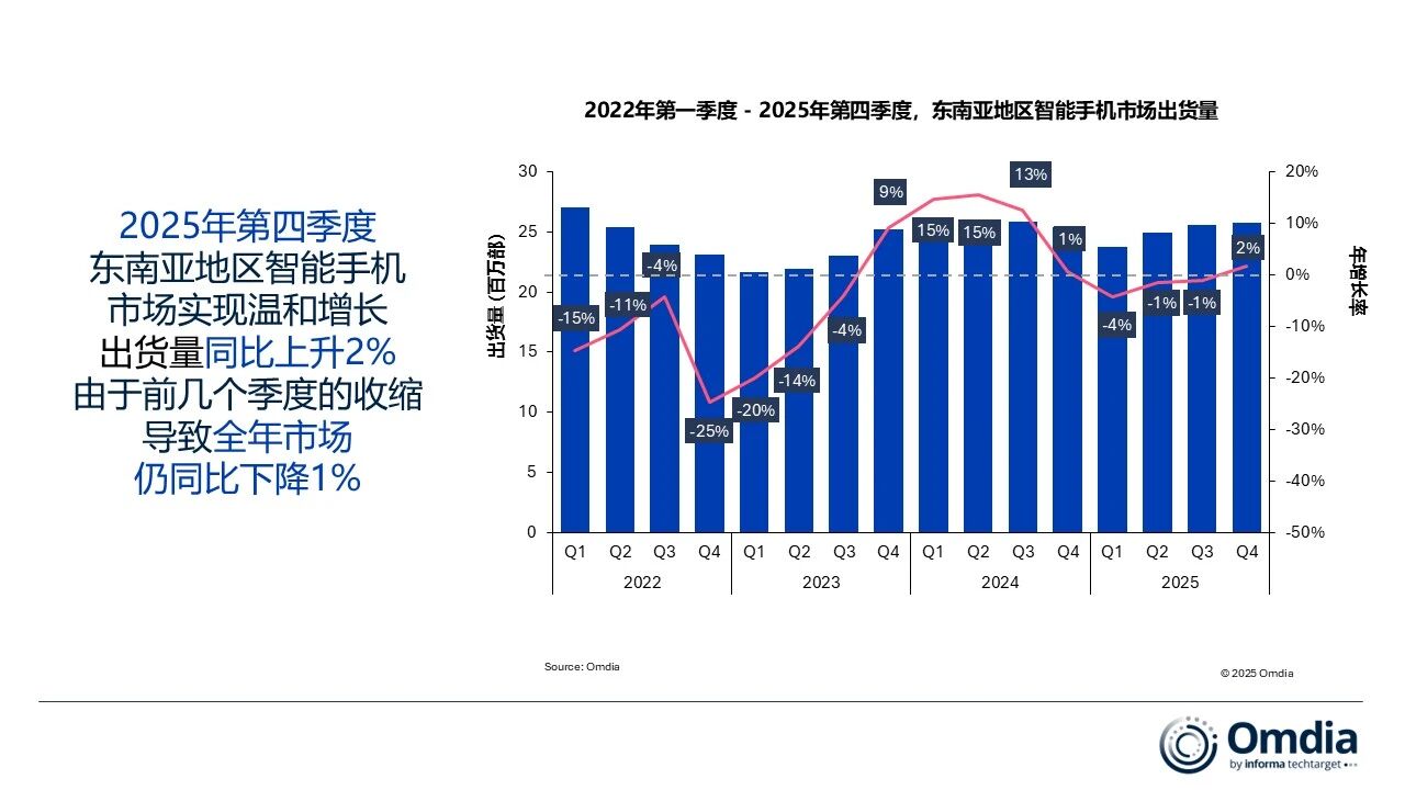 根据Omdia最新研究报告,2025年东南亚智能手机市场呈现先抑后扬态势,全年出货量达1亿部,较上年微降1%。这一波动主要源于前三季度市场持续低迷,但第四季度以2%的同比增长实现反弹,出货量攀升至2580万部,终结连续三个季度的下滑趋势,显示出年末消费需求回暖的积极信号。