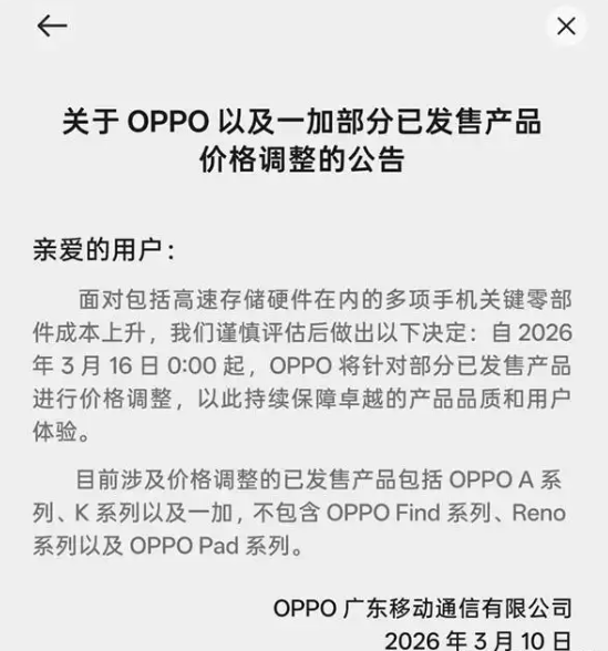 OPPO官方发布公告,宣布将对旗下部分已上市产品进行价格调整。此次调价涉及多个产品系列,主要原因是近期手机核心零部件成本持续攀升,尤其是高速存储等关键硬件价格显著上涨。
