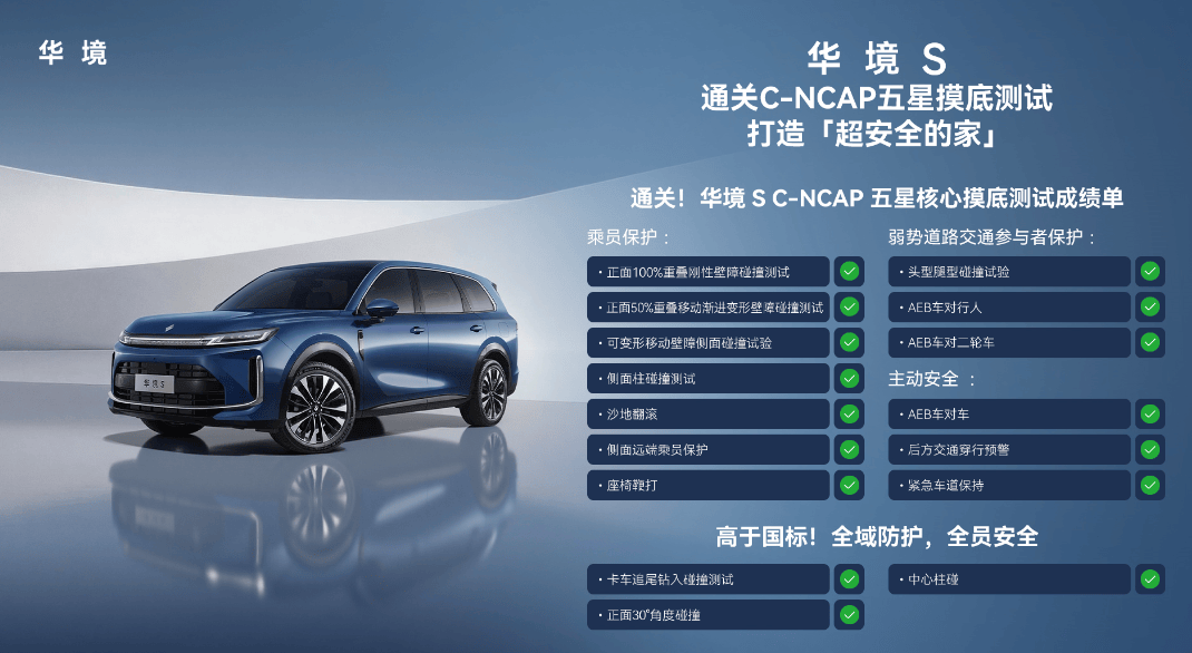 在乘员保护测试中,华境S经历了正面100%刚性碰撞、正面50%重叠碰撞(相对速度100km/h)、侧面碰撞及侧面柱碰等多项严苛考验。测试结果显示,碰撞后驾驶舱结构保持完整,车门可正常开启,E-call紧急呼叫系统自动激活,为乘员提供了可靠的生存空间和紧急救援保障。这些数据充分证明了车辆在被动安全设计上的卓越性能。