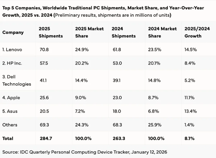 进入2026年,成本压力进一步加剧。全球DRAM和SSD价格大幅上涨,推动新一代MacBook Air与Pro再度涨价。Trend Force调查显示,2026年第一季度,传统DRAM合约价涨幅预测从55%–60%上调至90%–95%,NAND闪存涨幅从33%–38%上调至55%–60%。这波涨价已传导至PC整机市场,挤压终端厂商利润空间。Gartner预测,至2026年底,DRAM与SSD价格合计涨幅将达130%,推高全球PC平均售价约17%,最终导致全球PC出货量下降10.4%。