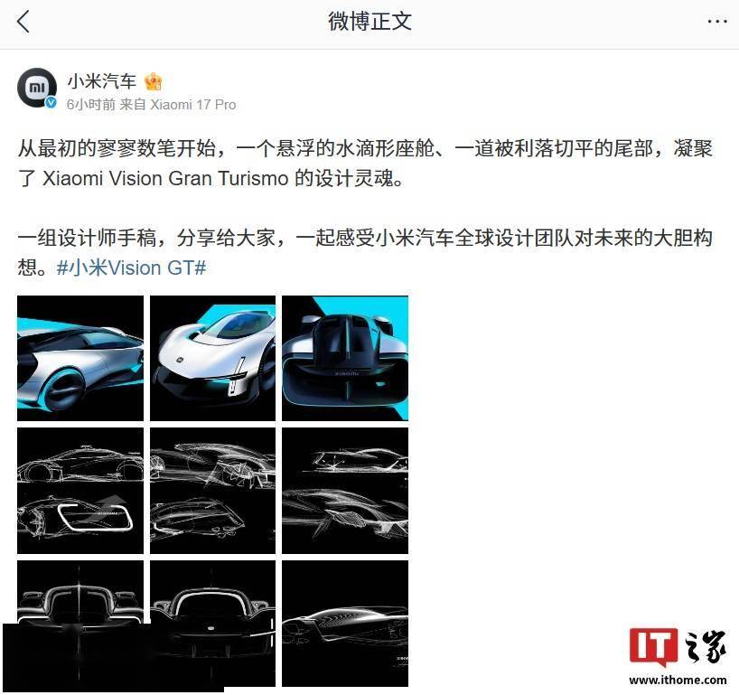 小米汽车全球设计团队近日公布了Xiaomi Vision Gran Turismo双门超跑的设计手稿,向公众展示了这款概念车的未来主义美学理念。作为一款以空气动力学为核心的设计作品,该车型从最初草图到最终定稿,凝聚了团队对创新与功能的深度思考。