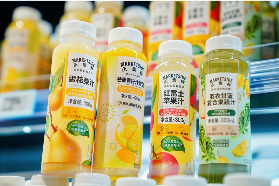 沃尔玛的转型离不开对自有品牌"沃集鲜"的重点打造。自2019年推出以来,沃集鲜的产品线不断丰富,SKU数量从最初的几十款增长至近千款,覆盖粮油、生鲜、食品等多个高频消费品类。在门店中,沃集鲜产品被摆放在显眼位置,占比显著提升,成为吸引消费者的重要因素。
