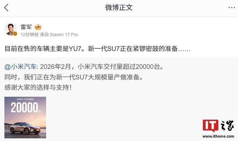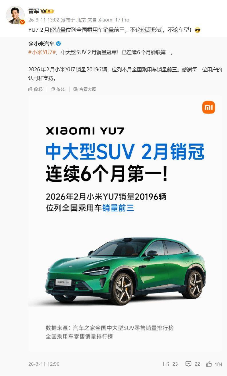 小米汽车近日公布了最新销售数据,旗下YU7车型在2026年2月实现交付量突破20000台,跻身全国乘用车销量前三。这一成绩涵盖所有能源类型及车型类别,展现出强劲的市场竞争力。据官方披露,YU7作为中大型SUV,已连续六个月蝉联细分市场销量冠军,2月具体销量达20196辆。