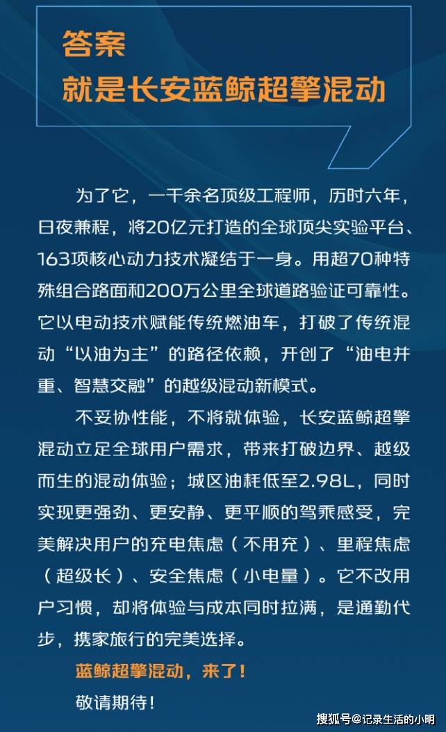 当汽车行业集体向纯电动化狂奔时,长安汽车却选择在燃油车领域投下一枚技术重磅炸弹——"蓝鲸超擎"混动系统。这套被官方定义为"不用充电的混动"方案,以2.98L/100km的实验室油耗数据引发行业震动,其核心逻辑是在传统燃油车与纯电动车之间开辟出全新赛道。