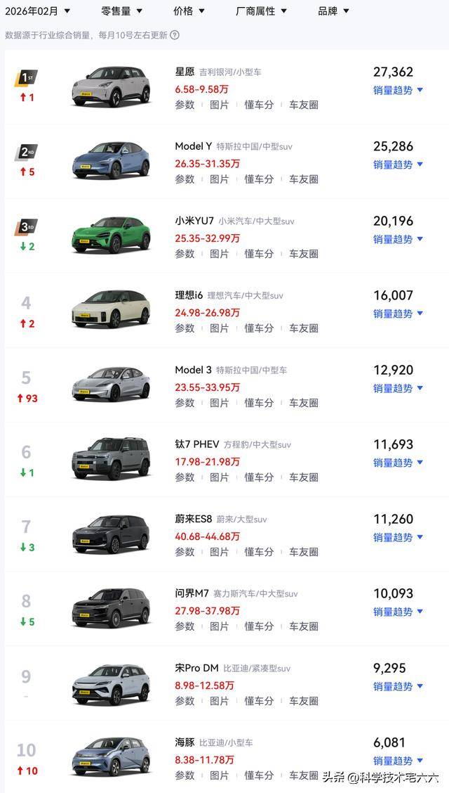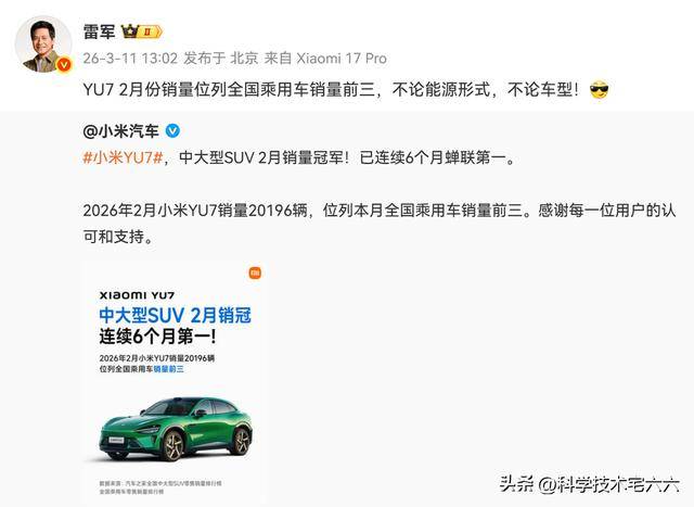 在新能源汽车市场竞争愈发激烈的背景下,小米汽车凭借旗下两款主力车型的出色表现,迅速跻身行业头部阵营。最新数据显示,小米YU7在2月以20196辆的销量成绩,成功闯入全国乘用车销量前三,并连续六个月蝉联中大型SUV细分市场冠军。这一成绩不仅刷新了小米汽车自身的销量纪录,更成为纯电车型在主流乘用车市场崛起的重要标志。