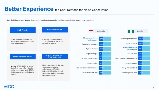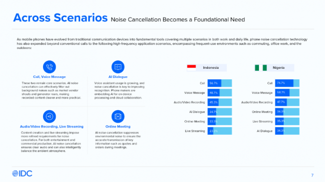IDC调研显示,在印度尼西亚和尼日利亚,分别有65.6%和69.3%的用户对手机降噪功能存在强烈需求,约三分之一用户在选购手机时将降噪能力视为重要考量因素。同时,由于当地蓝牙耳机普及率较低,手机端内置降噪能力成为提升通话体验的关键解决方案。