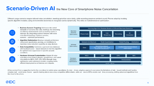 IDC在白皮书中指出,随着端侧AI算力持续提升,AI降噪技术正逐渐从智能手机扩展至更广泛的设备生态,并有望在汽车、智能家居、可穿戴设备以及会议设备等场景中实现技术复用,推动构建更加清晰、自然的全场景音频体验。