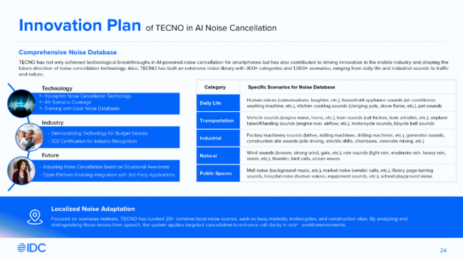 作为长期深耕新兴市场的智能终端厂商,传音在AI降噪技术领域持续进行本地化技术创新,并形成了系统化技术能力。为了让算法更好适配新兴市场复杂多样的声学环境,传音构建了涵盖300余类、1000多个细分真实场景的大规模噪声数据库,并针对海外用户环境采集了20余种典型本地化噪声场景,为AI降噪模型提供更精准的数据支持。