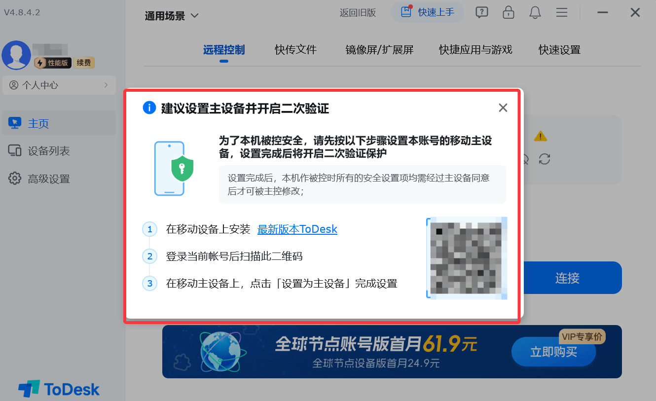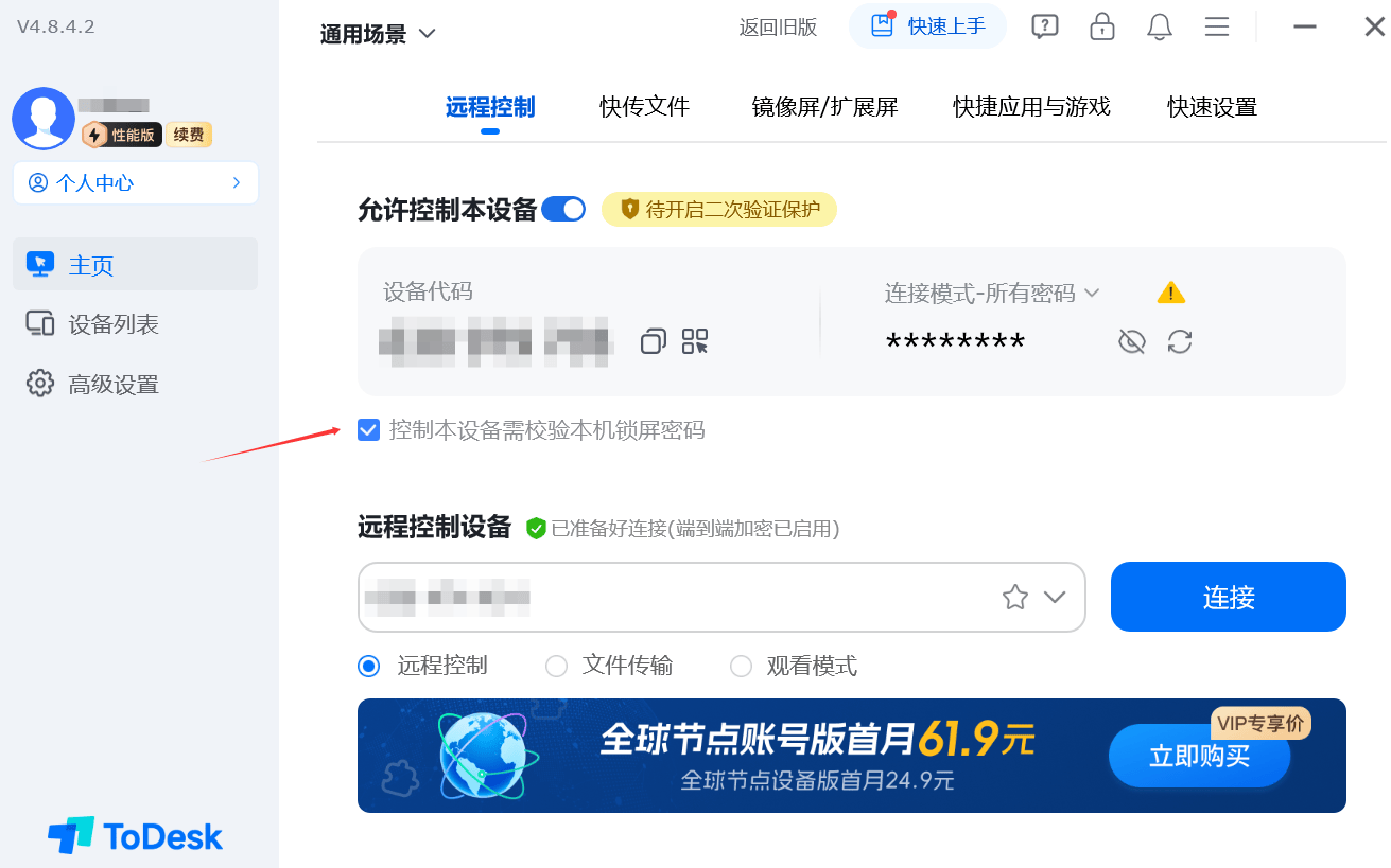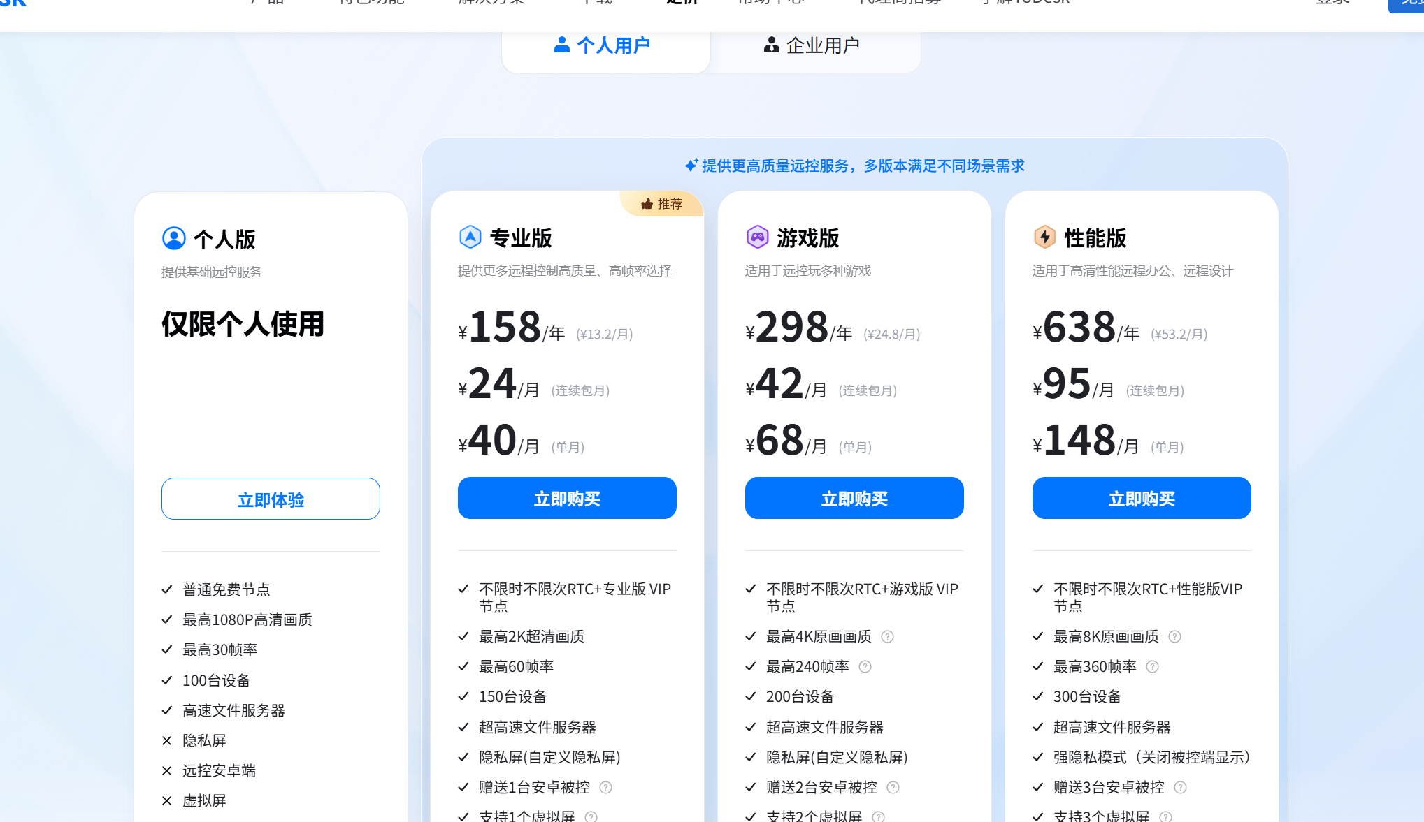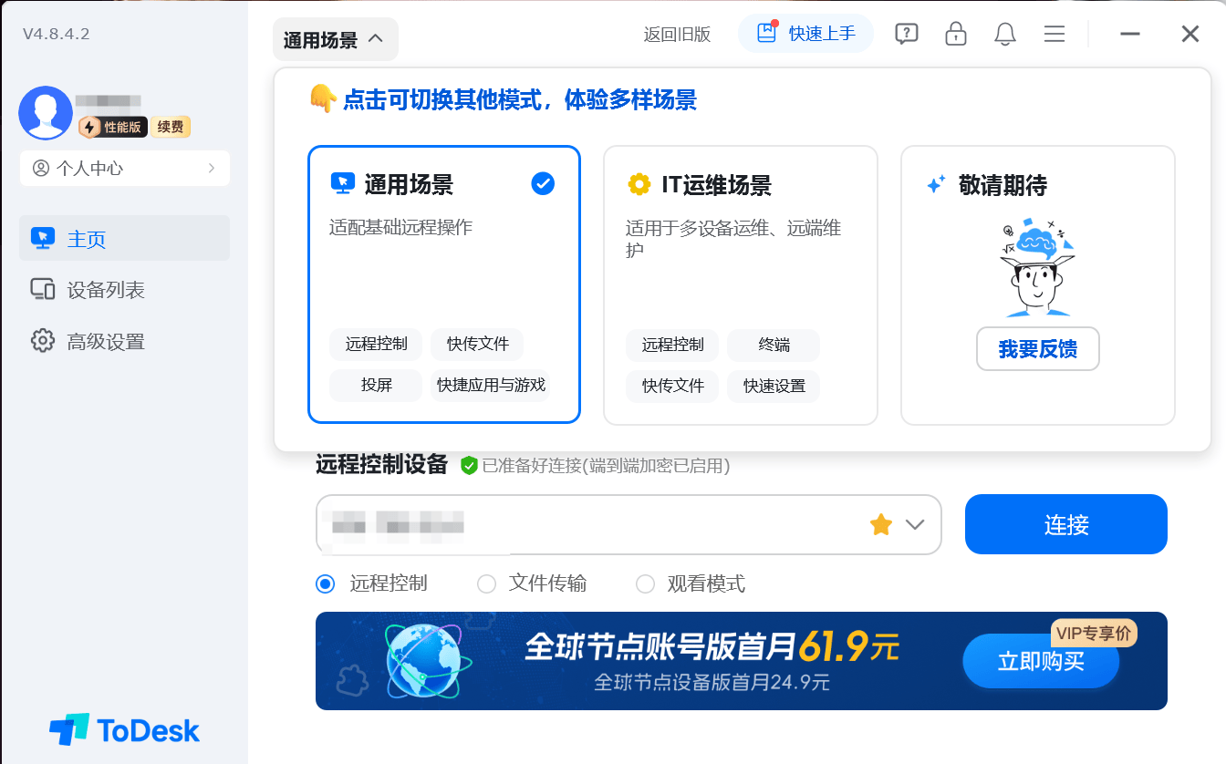 ToDesk的付费版本也是非常强大的,根据不同的需求一共支持3个付费的版本:分别是专业版、游戏版、性能版。