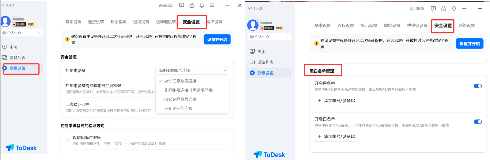 • 黑白名单: 和ToDesk的一样,通过黑白名单允许和限制某些特定设备。