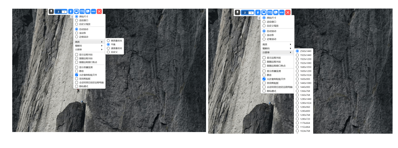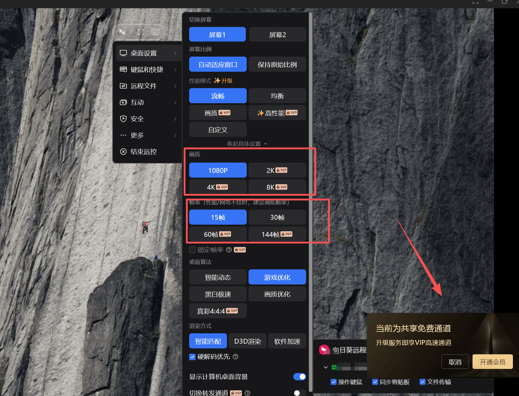向日葵远程控制支持 1080P、2K、4K、8K 的画质,并提供 15、30、60、144Hz 的帧率选择;其中仅 1080P 15Hz 和 1080P 30Hz 是免费的,其他分辨率或更高帧率需要付费/升级。