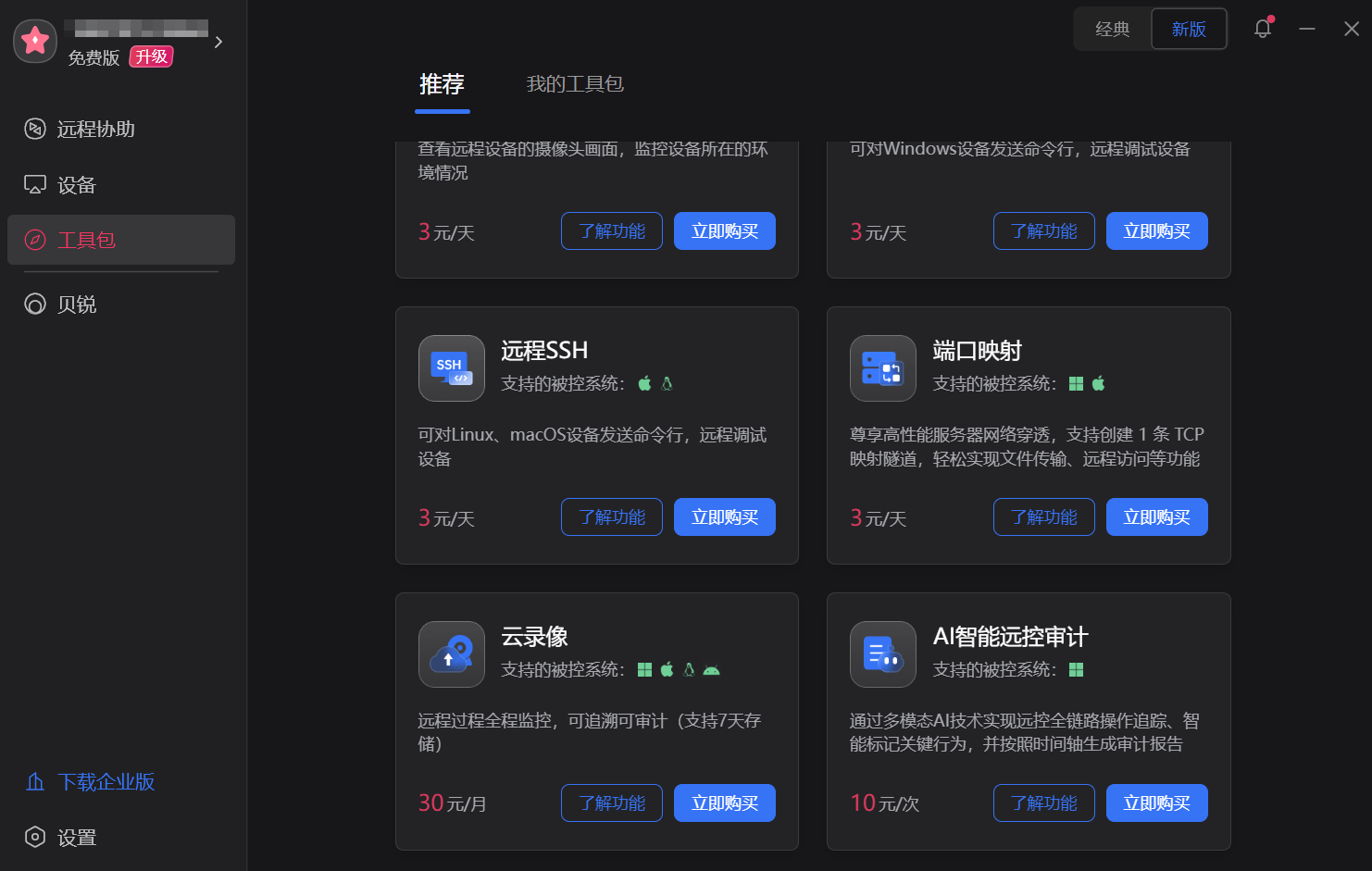 向日葵有一个专门的工具包,功能确实很丰富,覆盖了远程控制、文件管理等多个方面,整体工具箱很完整,适合企业级或专业用户使用。不过这些功能大多需要付费才能解锁,免费版本的可用性比较有限。
