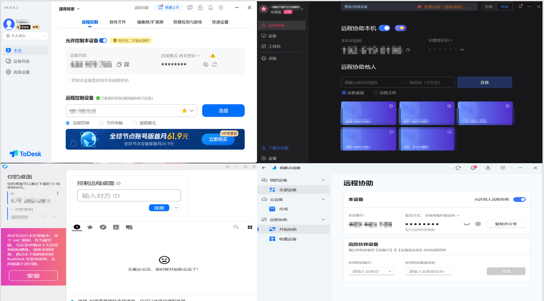ToDesk、向日葵、RustDesk 和 UU远程这几款软件都非常注重简洁性,用户一进入主页,就能清楚地看到远程控制码,操作非常直观。只需在设备上输入远程控制码,连接就能顺利建立,整个过程无需复杂配置,几乎可以立即开始远程操作。无论是启动软件还是进行远程连接,都非常简便,适合需要快速上手的用户。