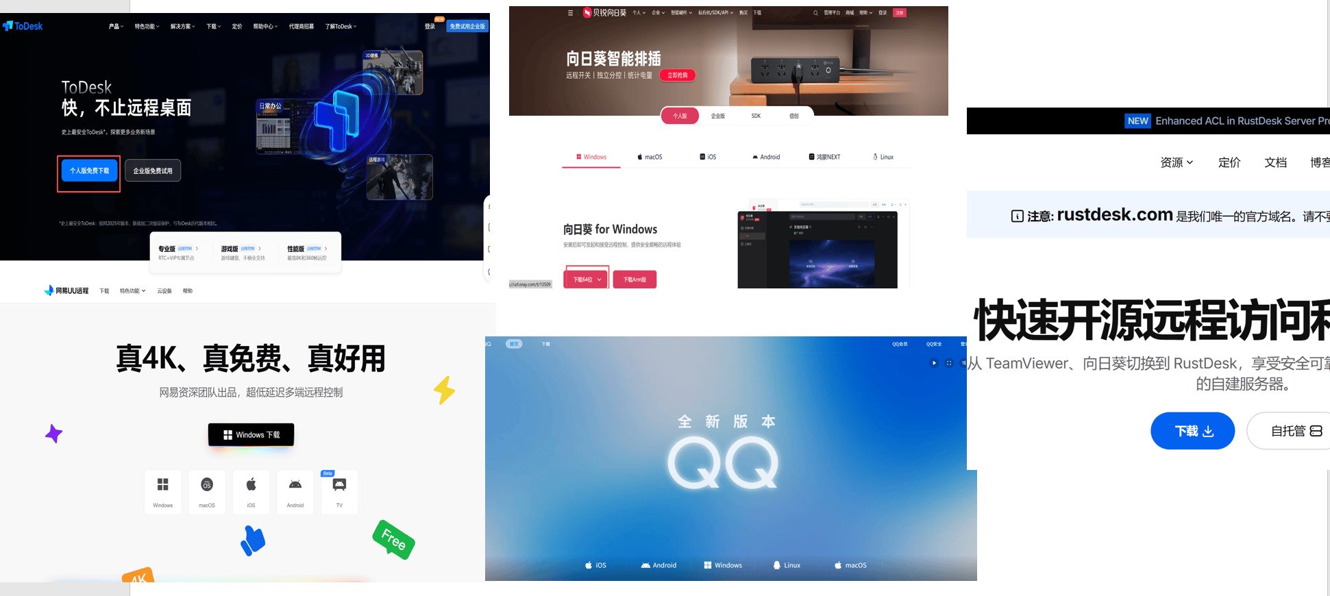 我会使用到ToDesk、向日葵、RustDesk、UU远程、QQ这五款远程控制软件来进行测试,帮大家选择出最好用的远程控制软件。
