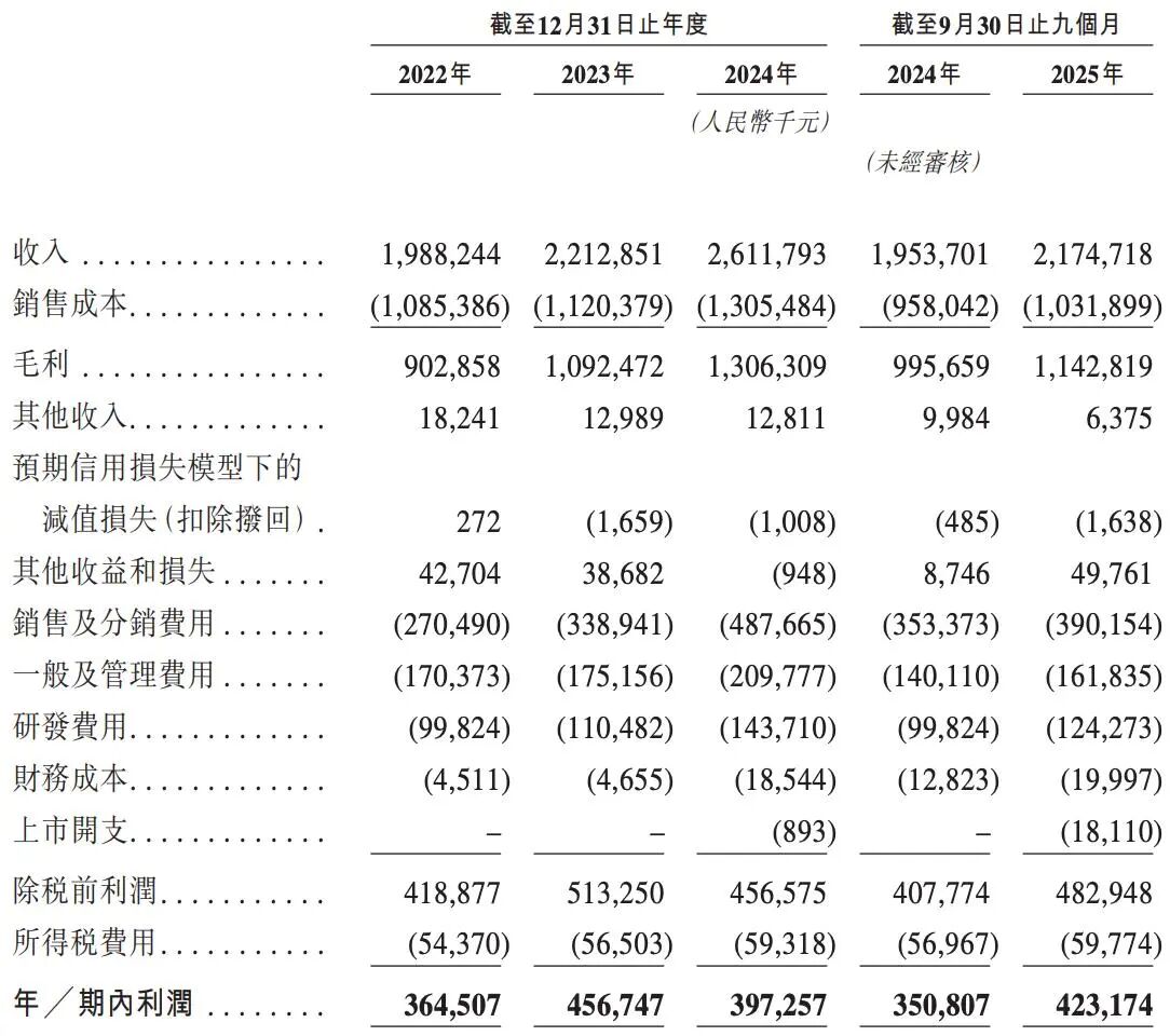 若按非国际财务报告准则计量,飞速创新的经调整净利润表现同样亮眼。2022年至2024年,经调整净利润分别约为3.88亿元、4.70亿元和4.08亿元;2025年前三季度约为4.61亿元。公司预计2025年度营收约为29.66亿元,同比增长13.55%;净利润约为6.01亿元,较2024年同期的3.97亿元增长51.4%,显示出强劲的增长潜力。