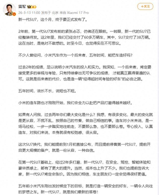 小米汽车创始人雷军在社交平台正式对外宣布,新一代小米SU7即将在本月开启大规模交付,同时确认新车价格将因原材料成本上涨而有所上调。这一消息引发市场广泛关注,消费者对产品升级后的定价策略保持高度期待。