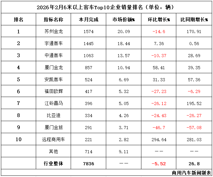 根据中国客车统计信息网的最新数据,2026年2月,6米以上客车市场共销售7836辆,环比下降5.52%,但同比增长26.8%。这一增长是在去年2月销量基数较高、且本月有效工作日减少的背景下实现的,进一步印证了市场的持续回暖。环比下滑主要受工作日减少影响,而同比数据更能反映市场真实发展趋势。