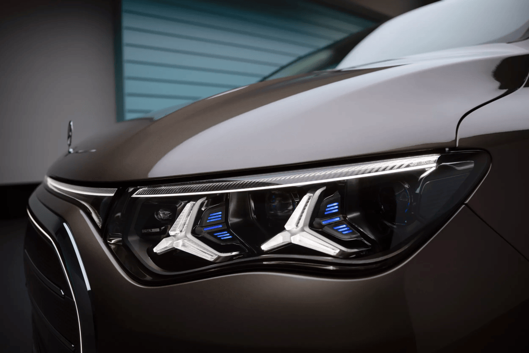 外观方面,VLE采用流线型设计语言,前脸配备大尺寸封闭式格栅,可选装发光环绕灯带,两侧星阵式大灯组与引擎盖隆起的筋线形成视觉呼应,三叉星徽标强化品牌辨识度。用户还可选装AMG运动套件,包括更具攻击性的前保险杠与中央带星徽图案的全新格栅设计。车身侧面隐藏式平推门把手与电动侧滑门实现无缝衔接,车窗可完全降下,轮毂提供19至22英寸多种规格选择。直立式车尾搭配集成于扰流板的弧形贯穿式尾灯,风阻系数低至0.25。车辆配备可独立开启的后挡风玻璃与向下开启的充电口盖,设计细节凸显实用性。