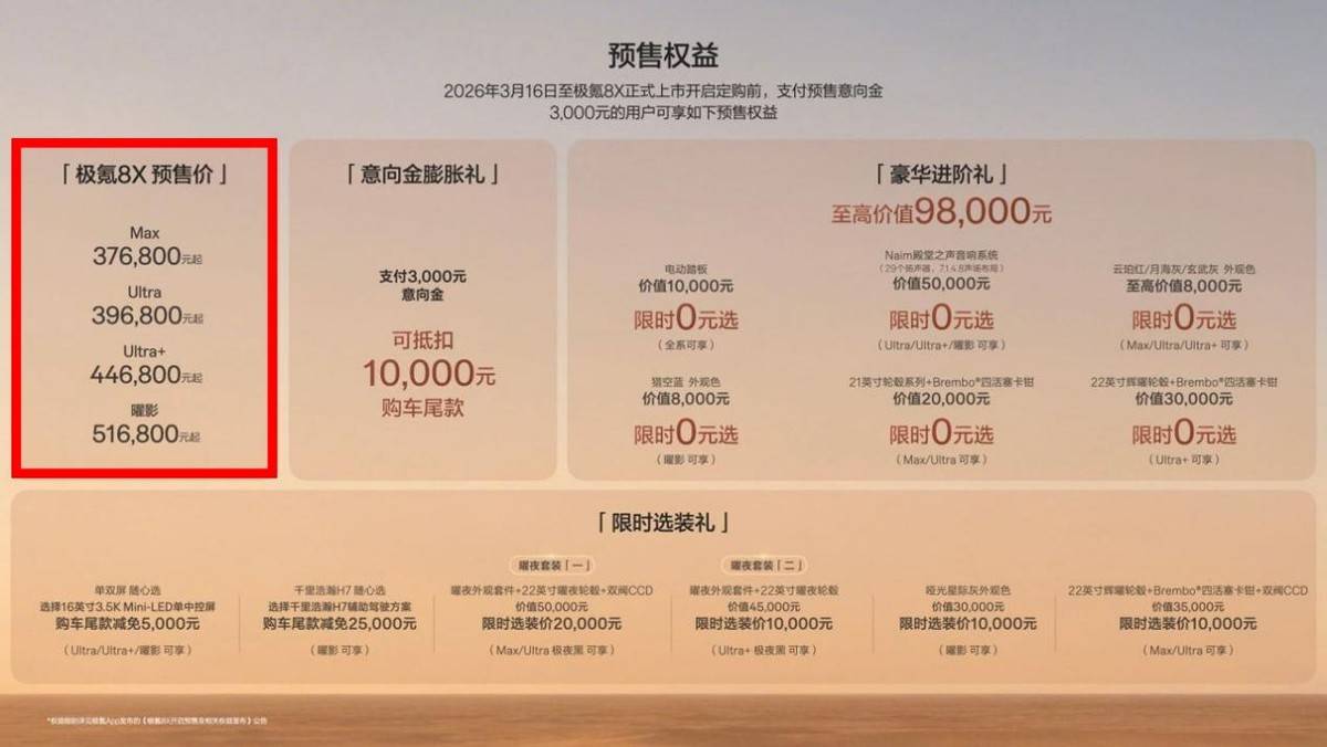 3月16日,极氪汽车携全新高性能旗舰SUV——极氪8X正式开启预售,预售价区间为37.68万元至51.68万元。这一价格区间在中大型新能源SUV市场引发了广泛讨论,有人认为顶配车型突破50万元大关需要勇气,也有人因其配置丰富而称其为“价格屠夫”。