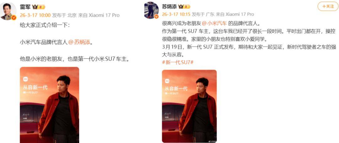 回溯双方合作渊源,2021年东京奥运会期间,苏炳添以9秒83刷新亚洲纪录时,就曾担任小米品牌代言人。此次代言汽车业务,雷军透露曾向苏炳添赠送钻石黑配色SU7 Max。两位公众人物还曾在广州车展同框亮相,共同体验多款热门车型,引发现场观众热烈关注。