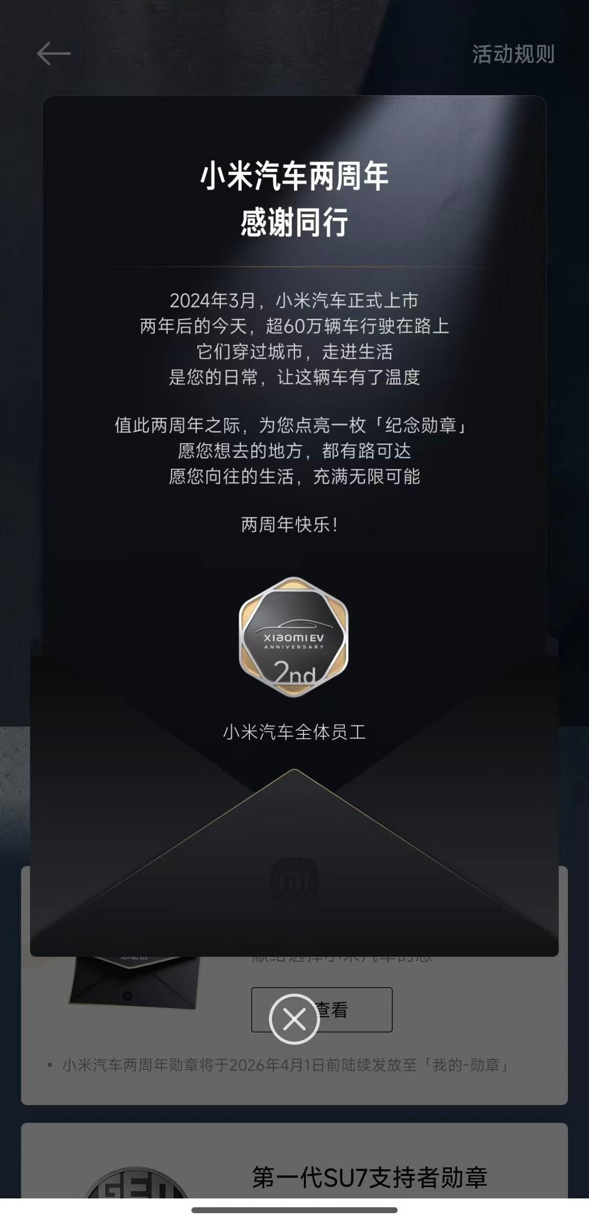 除了冰箱贴外,小米汽车还为车主们准备了一份特别的纪念——点亮了一枚“纪念勋章”,以此庆祝小米汽车上市两周年的重要时刻。这一举措不仅增强了车主的归属感,也体现了小米汽车对用户的关怀与重视。