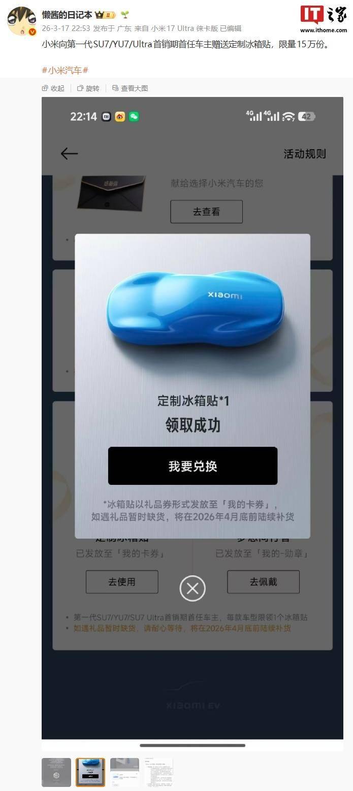 近日,小米汽车针对特定车主群体推出了一项特别福利活动。据悉,此次活动面向小米第一代SU7、YU7以及Ultra车型在首销期内购买的首任车主,小米将为这些车主免费赠送限量版定制冰箱贴,总计发放15万份。