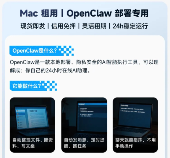 人人租此次解决方案的核心优势体现在载体选择与服务模式两大方面。载体上,选定Mac设备作为OpenClaw部署载体,其搭载的M系列芯片能提供高效算力,且原生系统具备稳定性强、低功耗的特性,可满足OpenClaw 24小时不间断运行的自动化需求,有效避免设备故障影响业务连续性,完美适配AI办公工具长期运行的场景诉求。服务模式上,以轻量化租用模式降低了企业应用高端AI工具的成本与技术门槛,同时凭借全流程的配套服务,解决用户的技术顾虑,让OpenClaw的落地应用更简单、更高效。
