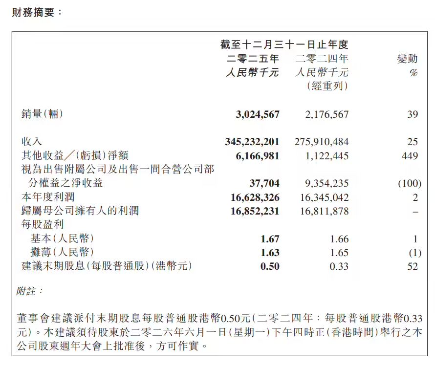 收入方面,吉利汽车2025年实现3452.32亿元,创下历史新高,同比增长25%。尽管归属于母公司所有者的利润为168.52亿元,与上一年度基本持平,但公司在市场拓展和规模效应上的突破仍值得关注。董事会同时宣布,建议向股东派发末期股息每股普通股0.50港元,较上一年度增长52%,体现了对股东回报的重视。