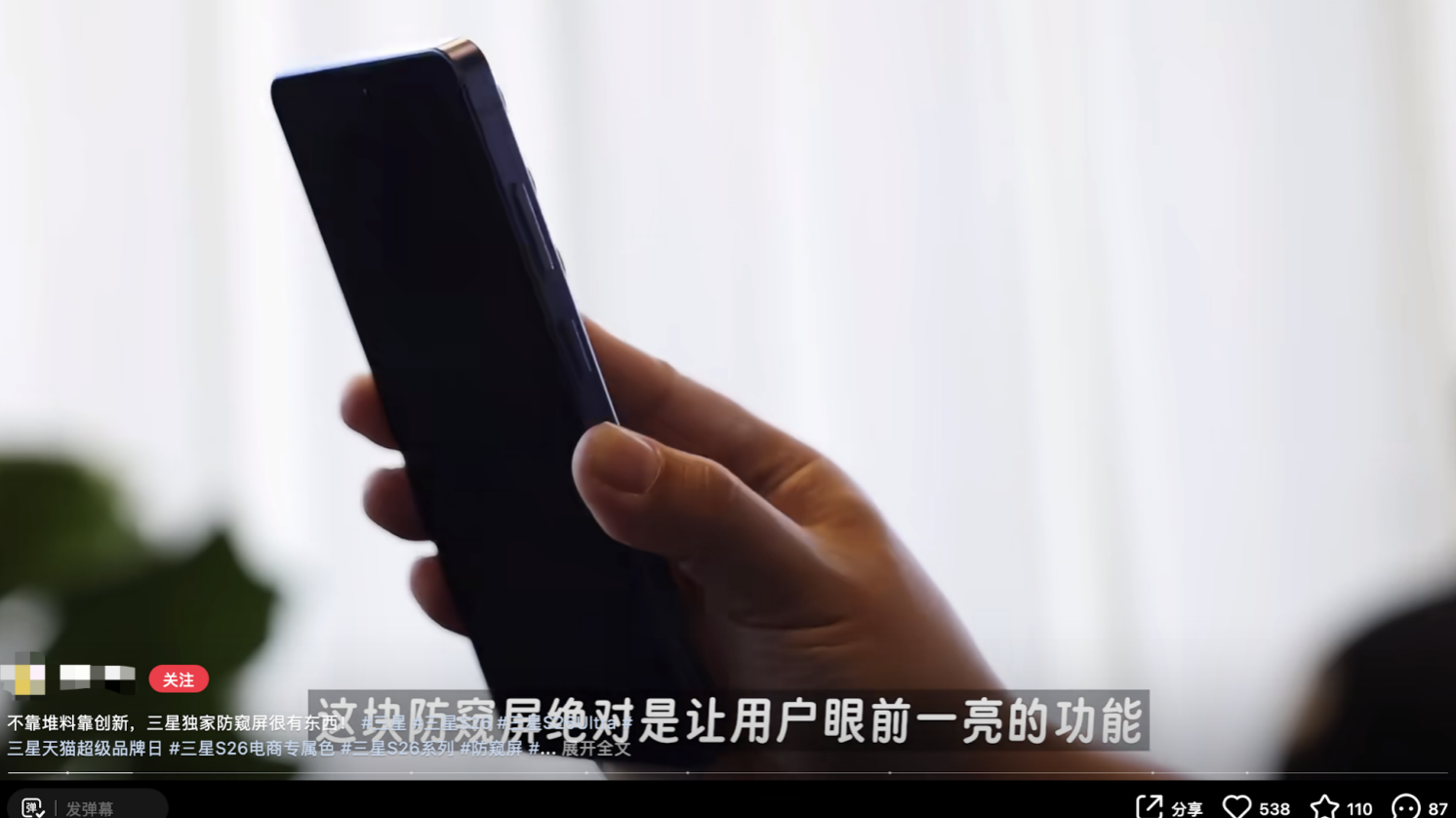 Galaxy S26 Ultra也成为了明星同款防窥手机,有明星在微博分享上手视频,感慨:“之前的手机普通的屏幕就特别容易尴尬,比如在后台看歌词草稿,改行程的时候看工作消息,机场里面刷手机,就很担心被旁边的人看到,有时候收验证码、弹消息也比较介意被别人无意间瞟到,现在就安心多了。”