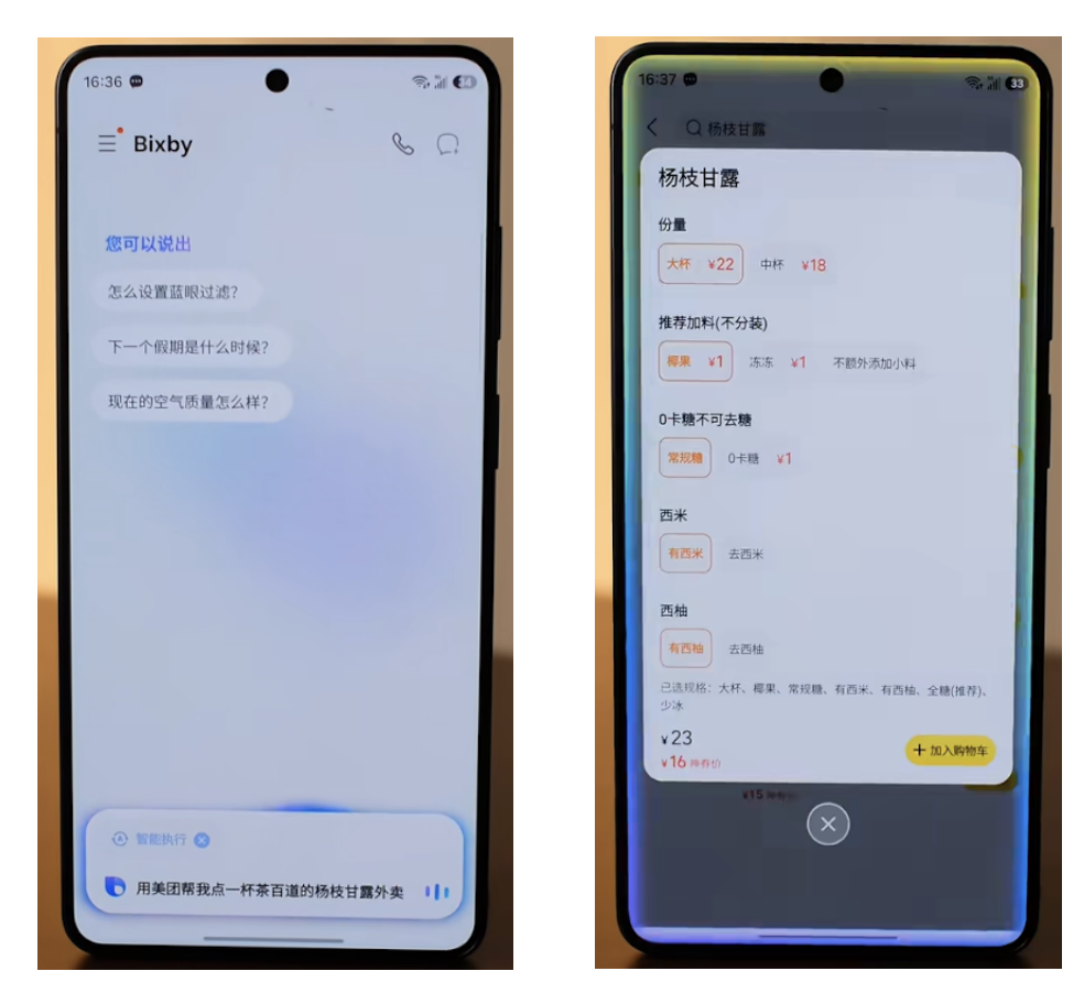 最直观的体现是升级后的Bixby。某博主在测评视频中展示:最新版的Bixby在他的指挥下能帮忙播放电视剧、点外卖,样样都行。众多评测也证实,新一代Bixby不再是过去那个只会定闹钟的语音助手,而是蜕变成能理解复杂语境的“执行者”——你可以用极其随意的自然语言让它帮忙做事,比如“帮我找上周日我和朋友在咖啡馆的那张照片”。