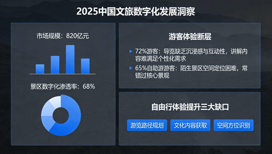 随着《2025中国文旅数字化发展白皮书》的发布,国内智慧文旅市场正迎来爆发式增长。数据显示,2025年市场规模突破820亿元,景区数字化渗透率达68%,但游客体验与硬件设施之间的断层问题日益凸显。调查显示,72%的游客认为景区导览缺乏沉浸感,65%的自助游游客在陌生景区中面临空间定位困难,游览路径规划、文化内容获取和空间方位识别成为制约自由行体验的三大痛点。