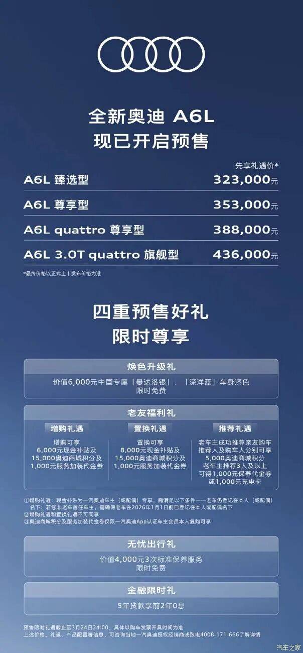 奥迪品牌近日宣布,旗下中大型轿车全新奥迪A6L将于3月25日正式登陆市场。作为换代车型,新车基于PPC豪华燃油车平台打造,在外观设计、车身尺寸、智能座舱、驾驶辅助及动力系统等方面均实现全面升级。目前,该车已开启预售,共推出4款配置版本,先享礼遇价区间为32.3万至43.6万元。