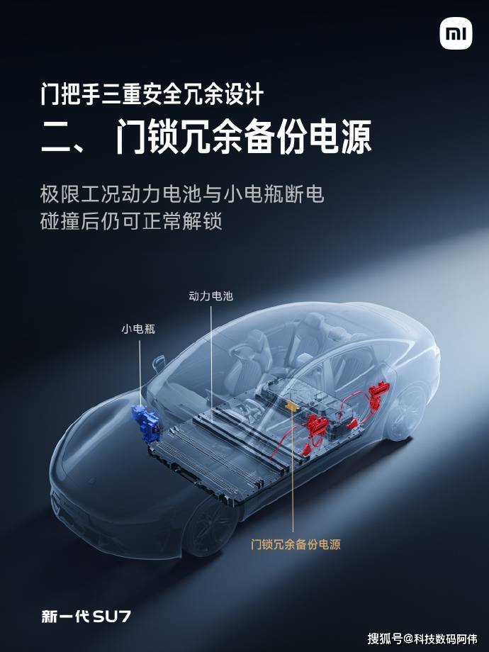车内方面,小米汽车在二排座椅下方增设了一块门锁专用的独立备份电源。即使全车高低压系统全部失效,这块独立电源仍能支撑四门进行电动解锁,为车主提供了额外的安全保障。四个车门的内侧均隐藏了机械拉线,车内乘客无需费力寻找中控锁开关,只需手动拉动拉线,即可完成自救开门。