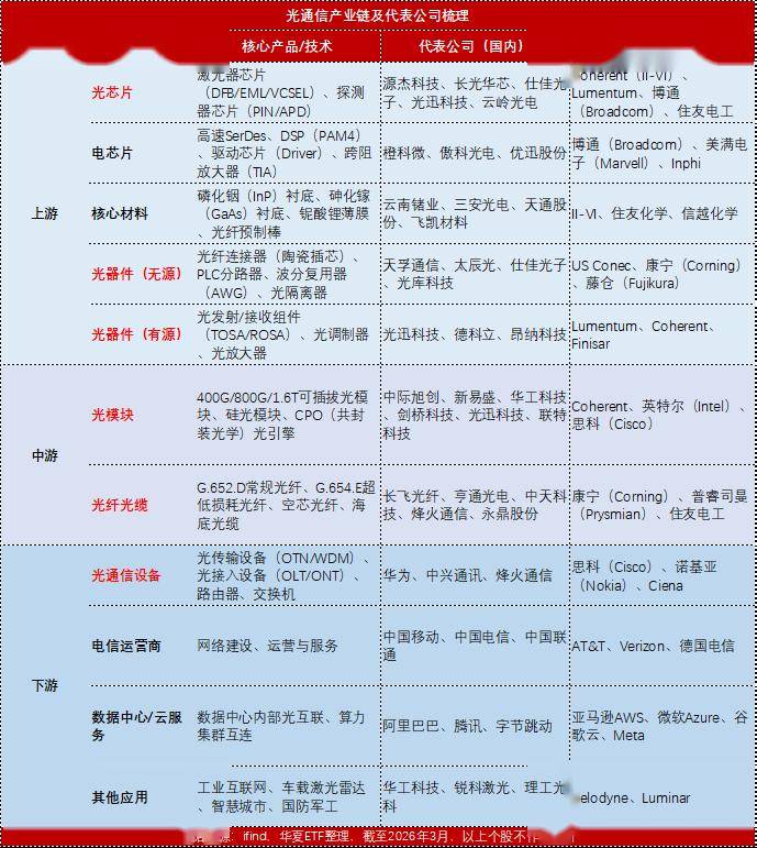 AI算力需求爆发背景下,光通信成为关键基础设施。传统电信号传输在带宽、损耗和功耗方面已达极限,而光信号凭借其高速特性成为破局关键。光通信以激光为载体、光纤为通道,构建起覆盖全球的AI运算网络。光模块、光芯片、光器件等细分领域均围绕这一核心展开。