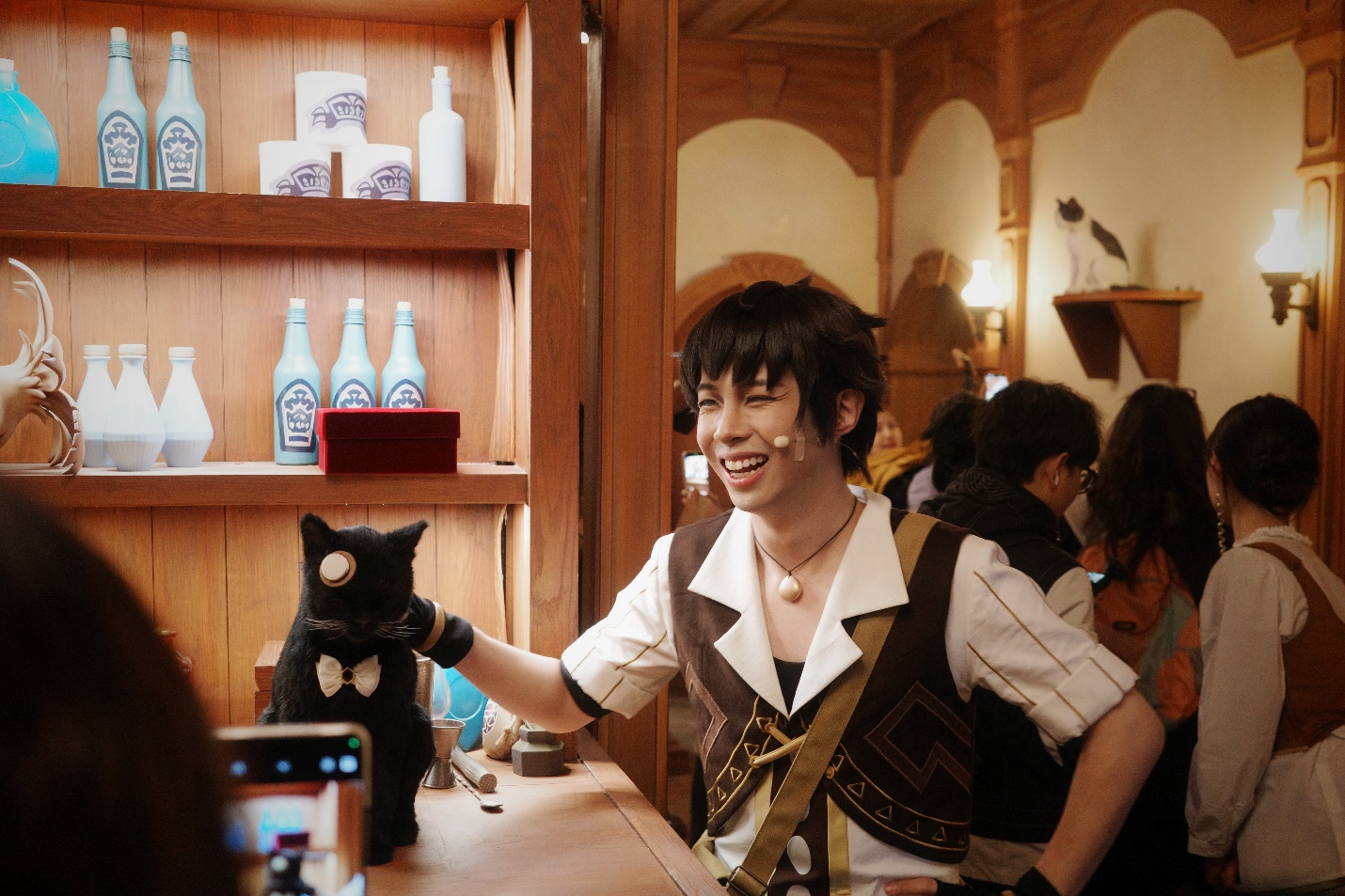 为了进一步提升沉浸感,活动主办方在场景搭建上下了不少功夫。以“猫尾酒馆”为例,这家在游戏中以猫咪众多而闻名的小酒馆,在现实中也得到了完美呈现。酒馆内布设了多只仿生机器猫,它们不仅外观毛发逼真,动作表现也极为自然,引得游客们纷纷驻足“撸猫”,拍照留念。