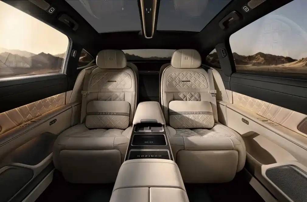 外观配色方面,新车采用浮光跃金与寰宇曜月的双拼设计,车身线条流畅且富有张力。内饰提供两种主题方案:浮光跃金搭配远航蓝、寰宇曜月搭配玛瑙黑,座椅选用潜沙白配色,并配备专属刺绣与徽章,彰显限量身份。车内音响系统搭载35个扬声器,四座均配备独立头枕扬声器,营造沉浸式座舱体验。