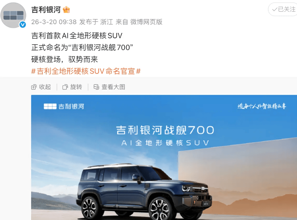 吉利银河品牌近日正式公布其首款AI全地形硬派SUV的命名——银河战舰700。这款被网友昵称为“杭州湾卫士”的方盒子造型车型,凭借独特的命名和硬核定位,迅速成为社交媒体热议焦点。许多消费者表示,若定价符合预期,该车有望成为新能源越野市场的新标杆。