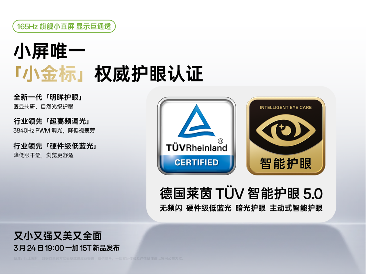 一加 15T 搭载全新「明眸护眼」技术,结合硬件级低蓝光与至低 0.04 的 SVM 行业领先低频闪,无论是暗光下追剧,还是长时间浏览文档,都能有效缓解用户视觉疲劳,配合七大 AI 主动护眼功能,成功斩获小屏手机唯一的「小金标」护眼认证,树立小屏旗舰护眼新标杆。