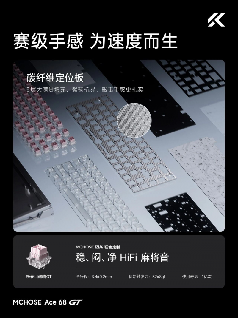 手感方面,迈从Ace 68 GT搭载了粉泰山磁轴GT,敲击声呈现出磁轴中难得的“稳、闷、净”HiFi麻将音,配合碳纤维定位板和五层大满贯填充,进一步优化内部结构,有效消除空腔音与共振杂音,确保每一次按压都扎实纯粹、反馈清晰。键盘侧面保留了独立RT按键,支持一键切换三套板载参数,方便不同游戏场景快速适配;机身底部采用铝合金阳极氧化装饰背板,提升整体质感与视觉层次;同时配备可拆卸人体工学手托,为长时间游戏提供更好的手腕支撑,缓解使用疲劳。