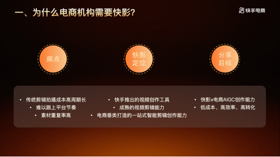 第二,AIGC:真实跑出来的效率提升。一家头部机构展示了他们的数据:接入AIGC工具后,内容生产效率提升300%,爆款率提升50%。本次会上,快手电商也发布了最新的AIGC工具,并开放部分使用名额,帮助大家解决解决脚本生成问题,在保持质量的同时提量;以及素材怎么用AI做多版本裂变的问题,提高测试效率。