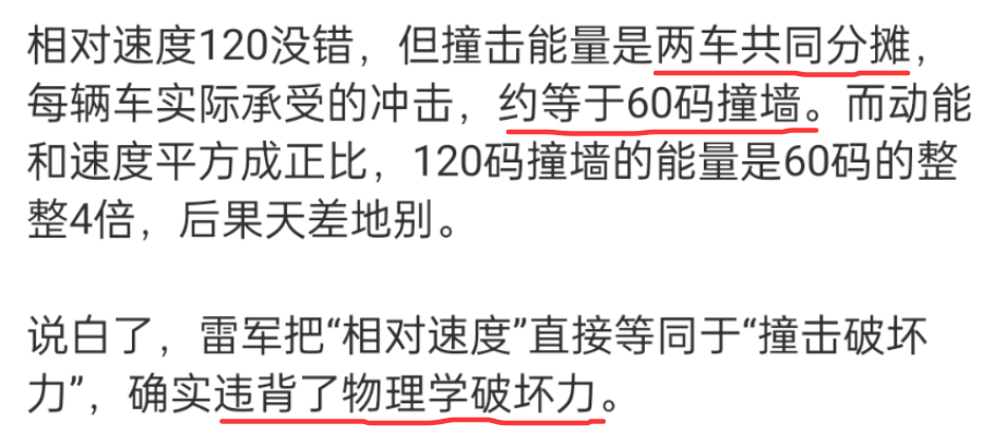 争议源于雷军对两车对撞测试的解读。他表示:“两辆车以60公里时速相向行驶,相对速度就是120公里,相当于以120公里时速撞墙。”这番表述引发理科生集体“纠错”——数学计算虽正确,但物理原理存在严重偏差。网友用生活化案例类比:“两杯50度温水混合不会变成100度开水”“十次10%成功率的手术叠加不等于100%康复”,直指相对速度与碰撞能量的本质区别。