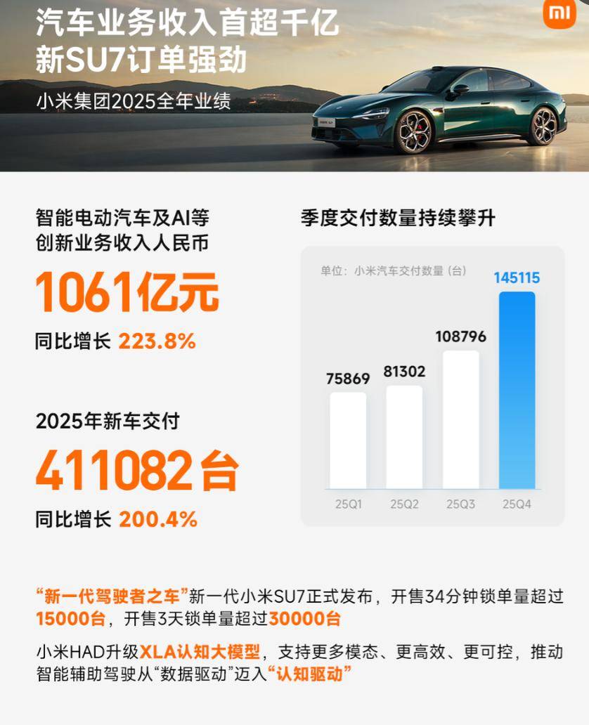 在核心产品端,小米汽车全年交付量突破41.1万辆,同比增长200.4%。这一增速远超行业平均水平,显示出其智能电动汽车在市场竞争中的强劲势头。交付量的跃升不仅带动了相关服务收入的增长,更为后续软件生态建设奠定了用户基础。